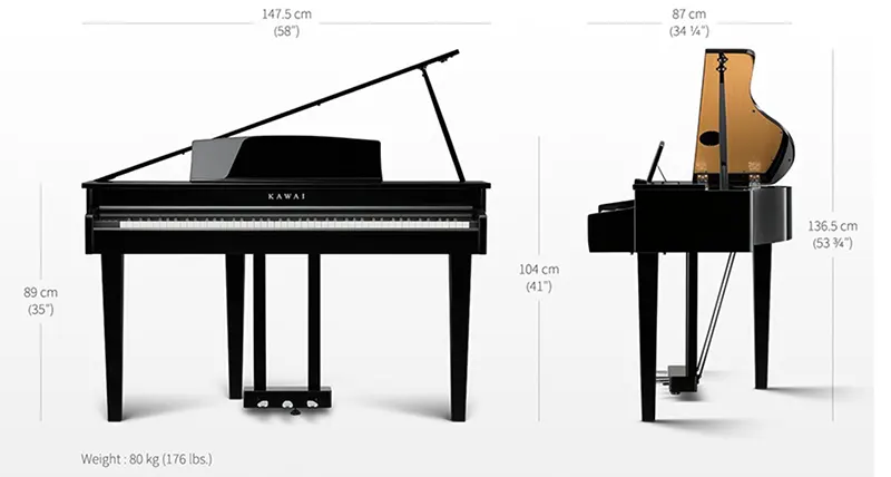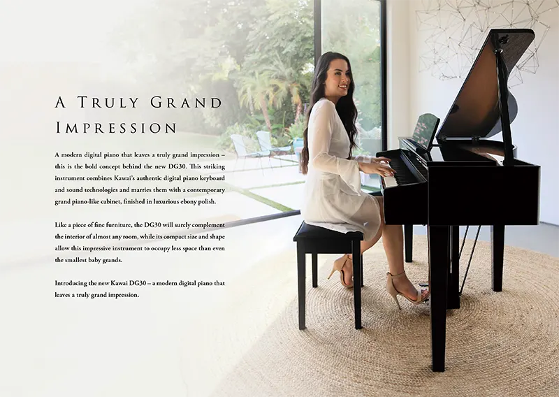 Kawai DG30 adalah digital grand piano modern yang menghadirkan perpaduan antara keanggunan grand piano mini dengan teknologi suara digital kelas premium. Dengan desain grand yang compact, DG30 memberikan tampilan mewah untuk ruang keluarga, studio, maupun ruang pertunjukan kecil tanpa memerlukan ruang sebesar piano akustik.