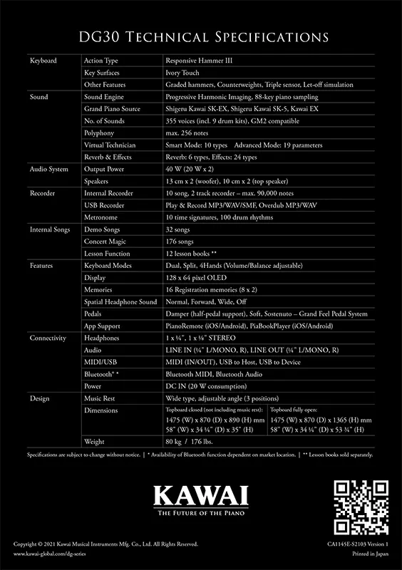 Spesifikasi Utama Kawai DG30: